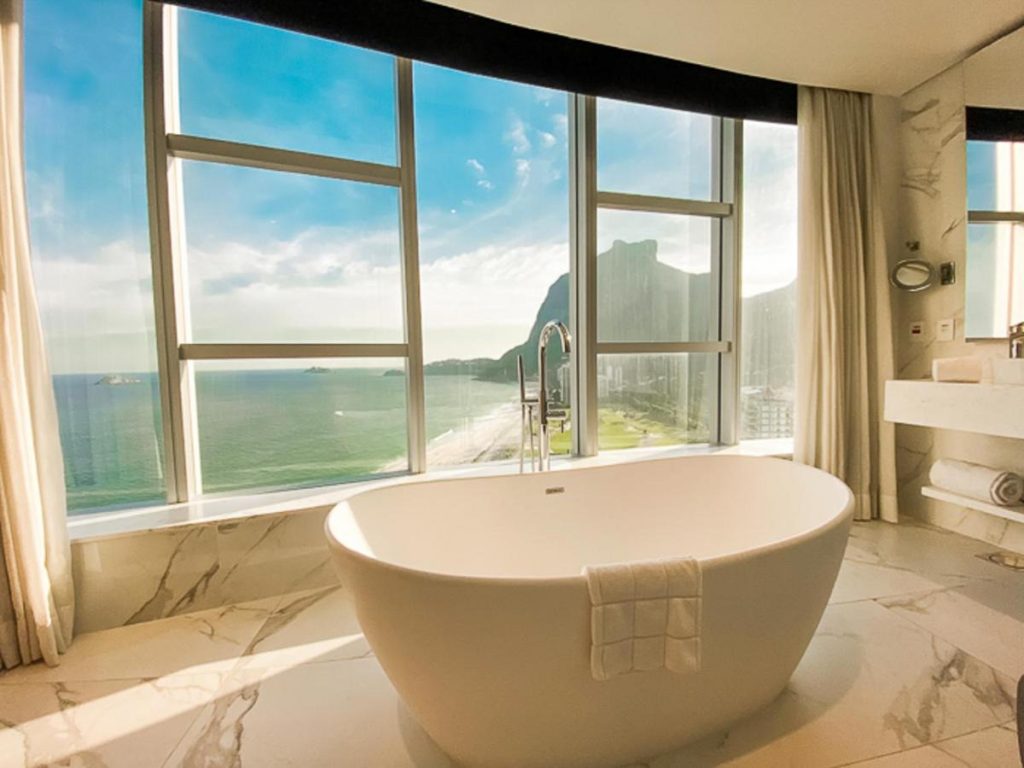 Restaurantes, bares e espaços de convivência permitem que os hóspedes aproveitem a atmosfera sofisticada do hotel enquanto apreciam a vista privilegiada da Praia de São Conrado.